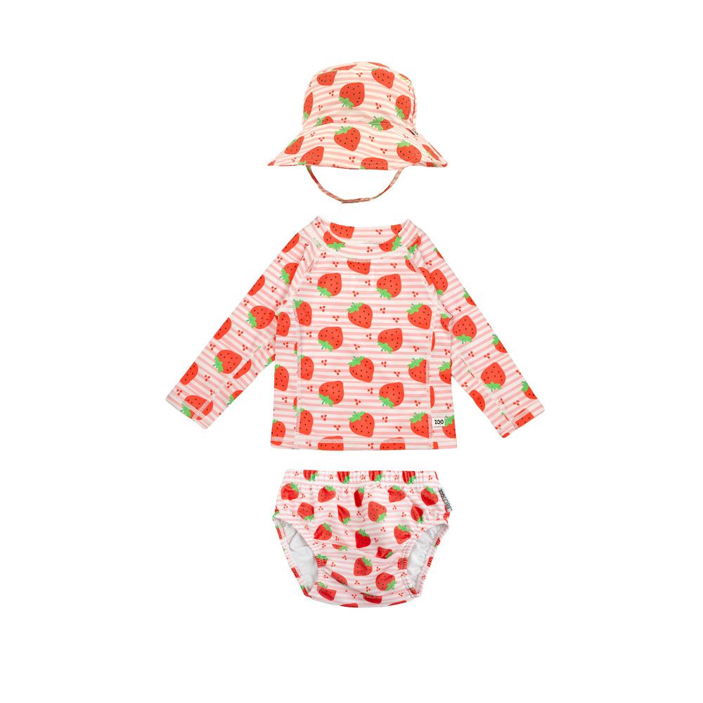 Δεν υπάρχει πιο χαριτωμένο σετ από το Σετ UV μαγιό-πάνα, καπέλο και μπλούζα Strawberry από την Zoocchini!