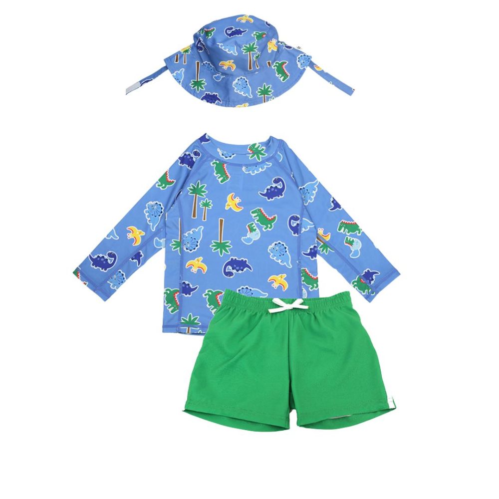 Δεν υπάρχει πιο χαριτωμένο σετ από το Σετ UV μαγιό, καπέλο και μπλούζα Devin the Dino & Friends από την Zoocchini!