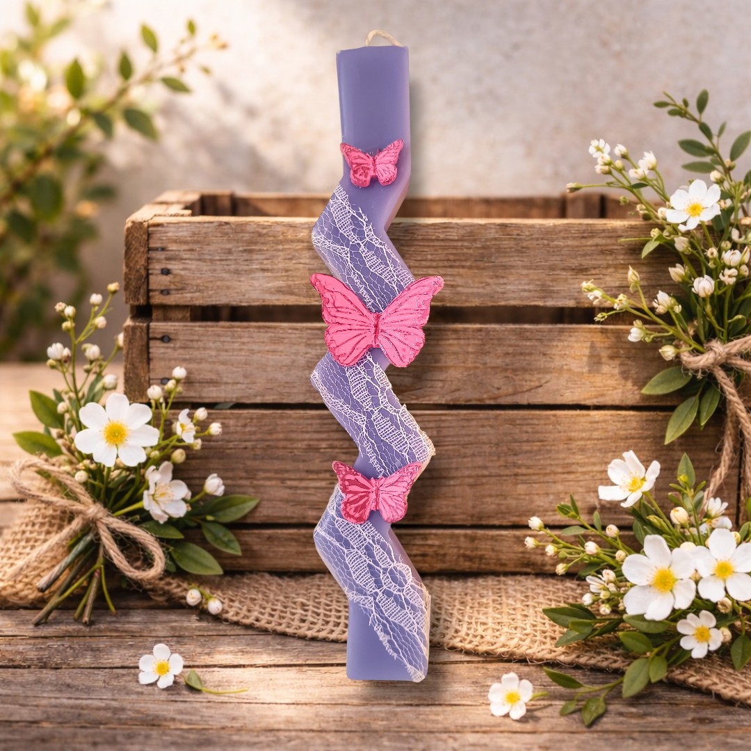 Χειροποίητη, αρωματική και ρομαντική, αυτή η λαμπάδα με τις πεταλούδες και τη δαντέλα είναι τέλεια για τις μικρές δεσποινιδούλες!