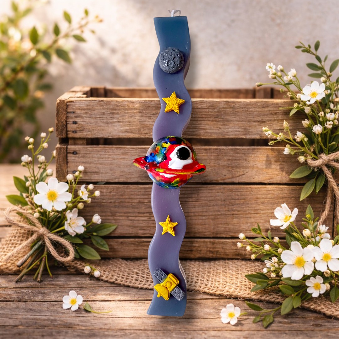 100% χειροποίητη αρωματική λαμπάδα παραφίνης με γύψινα διακοσμητικά στοιχεία σχετικά με το διάστημα που θα εντυπωσιάσει και θα ενθουσιάσει τα παιδιά! Η παραφίνη ως υλικό έχει αργή καύση και δεν στάζει εύκολα, όμως δεν διαχέει έντονα το άρωμα που περιέχει. Δεν ενδείκνυται να χρησιμοποιήσετε τυχόν κερί που έχει μείνει μετά την Ανάσταση ως wax melt.