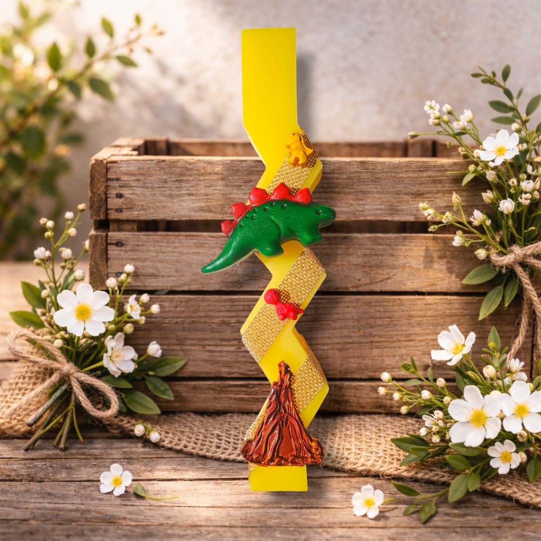 100% χειροποίητη αρωματική λαμπάδα παραφίνης, με γύψινα διακοσμητικά στοιχεία ζωγραφισμένα στο χέρι, σχετικά με την εποχή των δεινοσαύρων.