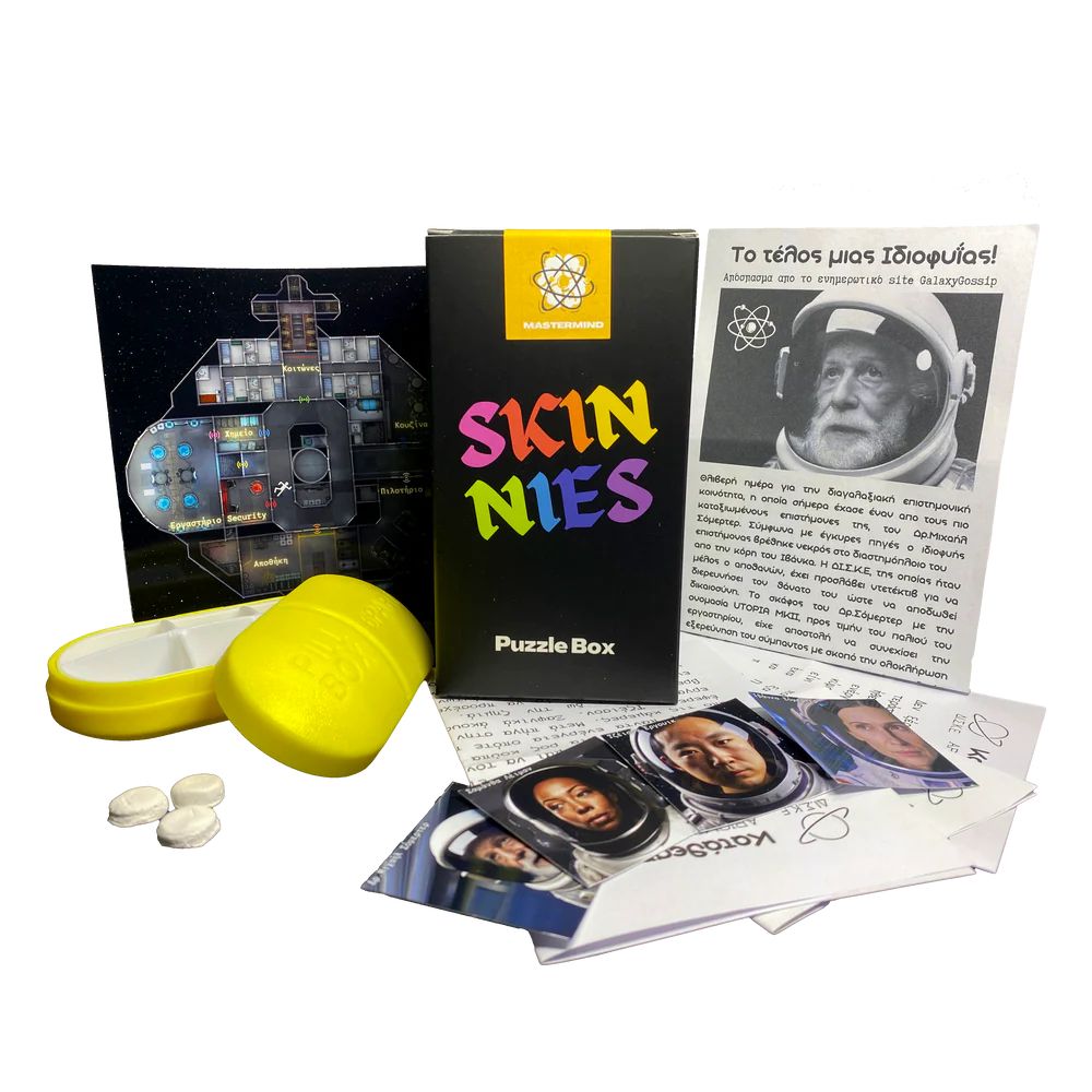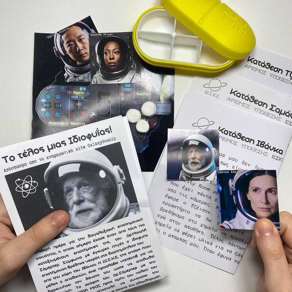 Στο κουτί περιλαμβάνονται: Χάρτης διαστημόπλοιου, διαγαλαξιακή εφημερίδα, θήκη χαπιών με 3 χάπια, οδηγίες φαρμάκων, 3 καταθέσεις του πληρώματος, φάκελος με επιπλέον στοιχεία. Προσοχή, περιέχει μικρά κομμάτια! Τα χάπια που περιέχει είναι φτιαγμένα από πηλό. Απαγορεύεται η κατάποση!
