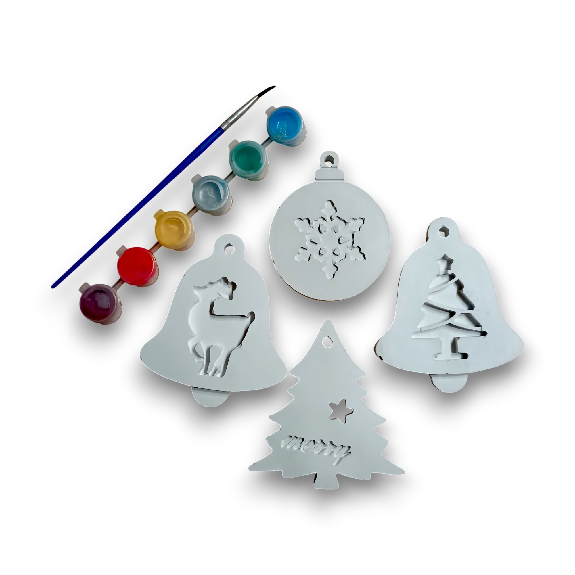 Σετ ζωγραφικής γύψινων στολιδιών που περιλαμβάνει 4 στολίδια, κορδέλα, 6 χρώματα τέμπερας (χρυσό, ασημί, μπλε, πράσινο, καφέ και κόκκινο) και πινελάκι, όλα μέσα σε μια όμορφη Χριστουγεννιάτικη συσκευασία!