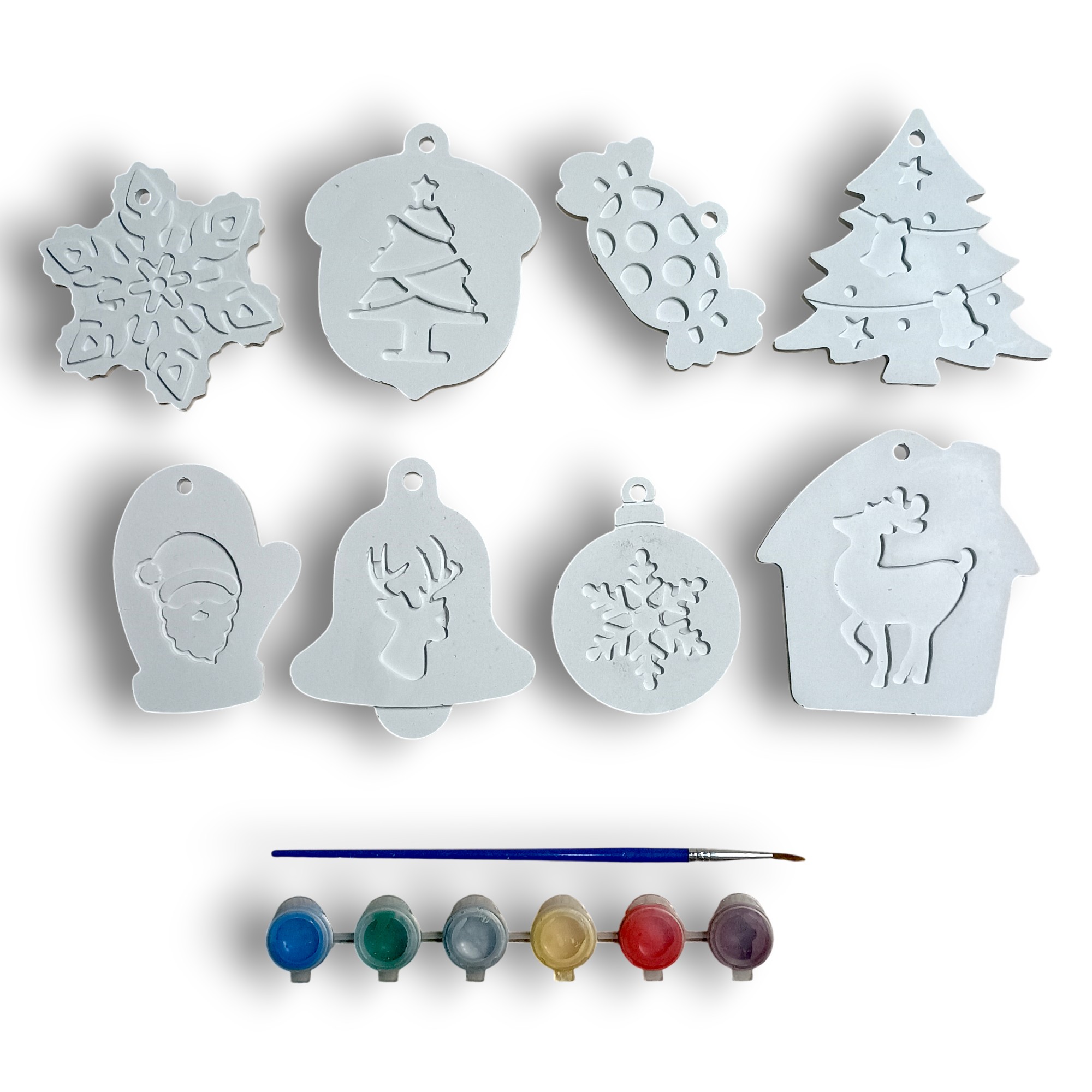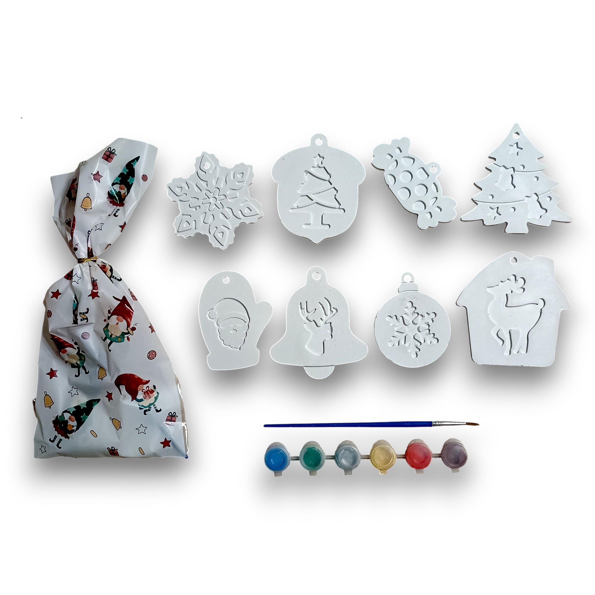 Σετ ζωγραφικής γύψινων στολιδιών που περιλαμβάνει 8 στολίδια, κορδέλα, 6 χρώματα τέμπερας (χρυσό, ασημί, μπλε, πράσινο, καφέ και κόκκινο) και πινελάκι, όλα μέσα σε μια όμορφη Χριστουγεννιάτικη συσκευασία!
