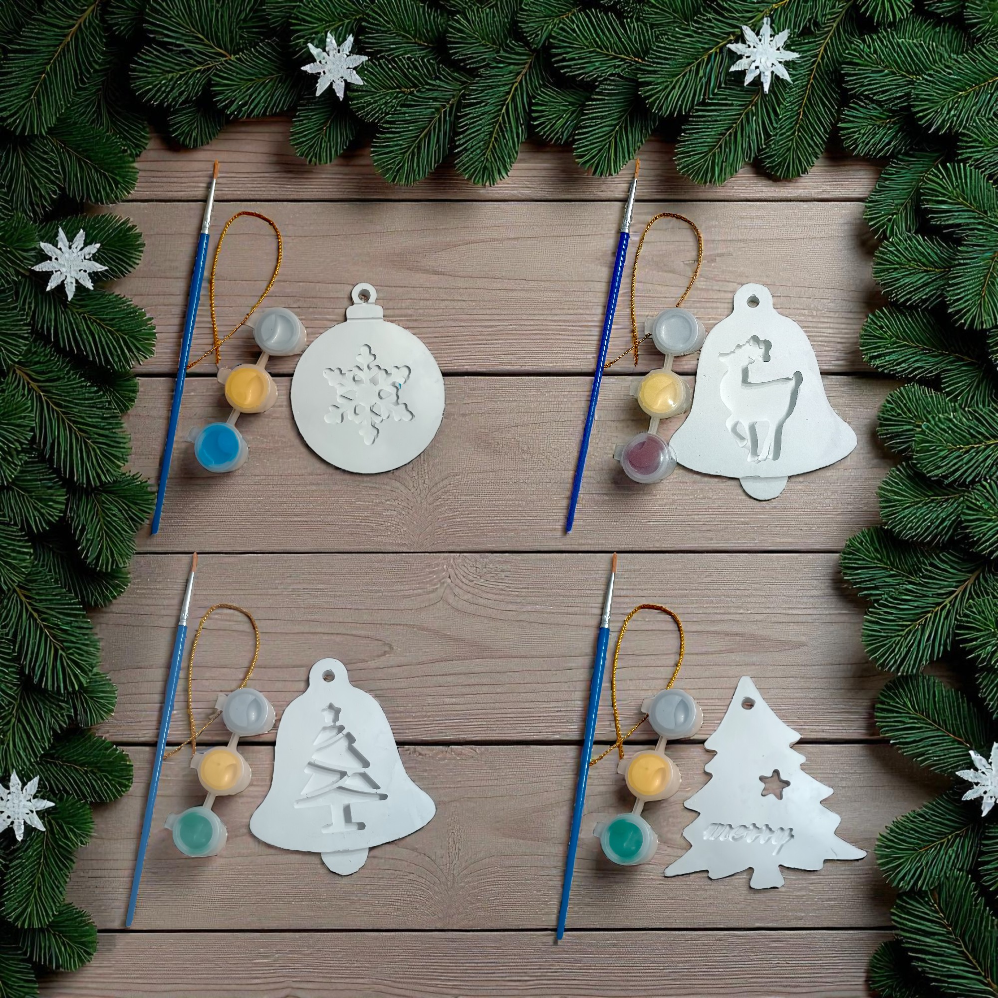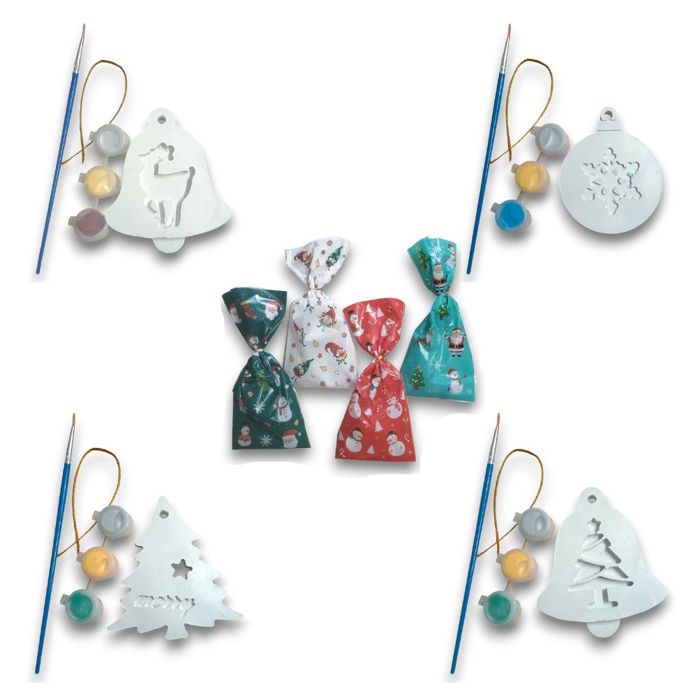 Σετ ζωγραφικής γύψινων στολιδιών που το καθένα περιλαμβάνει στολίδι, κορδέλα, 3 χρώματα τέμπερας (χρυσό, ασημί και μπλε/πράσινο/καφέ) και πινελάκι, όλα μέσα σε μια όμορφη Χριστουγεννιάτικη συσκευασία!