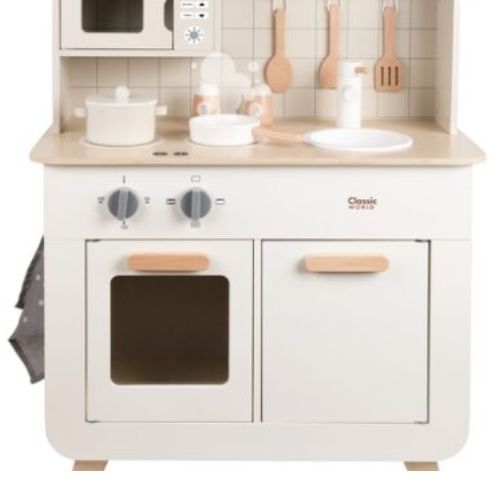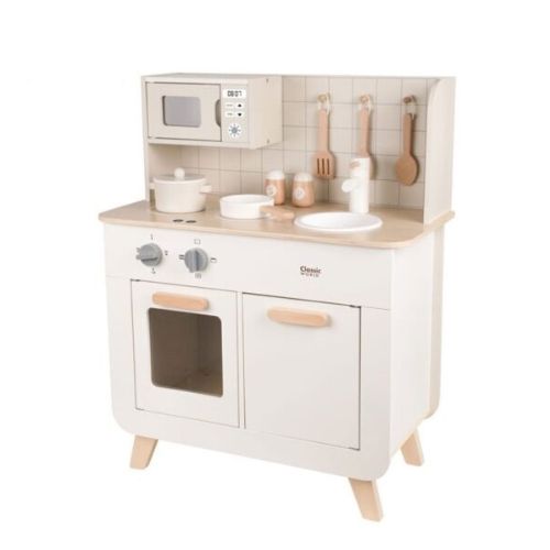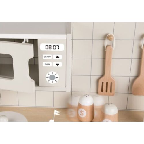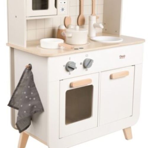 Σχεδιασμένη για παιδιά 3+, περιλαμβάνει 11 αξεσουάρ, φούρνο, φούρνο μικροκυμάτων, εστία και νεροχύτη — όλα όσα χρειάζεται ένα παιδί για να «μαγειρέψει» τις δικές του φανταστικές συνταγές. Το εργονομικό της μέγεθος και η ζεστή, ξύλινη αισθητική την κάνουν ιδανική για παιδικά δωμάτια, playrooms ή χώρους δημιουργικής απασχόλησης.