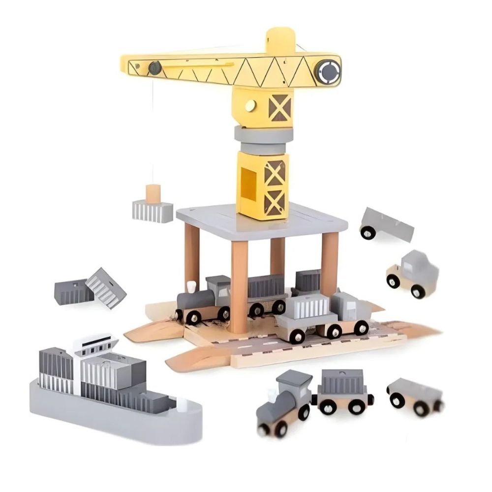 Με έναν γερανό που κινείται και έναν σιδηρόδρομο γεμάτο φορτηγά, τα παιδιά μπορούν να δημιουργήσουν αμέτρητες ιστορίες και να αναπτύξουν τη φαντασία τους.