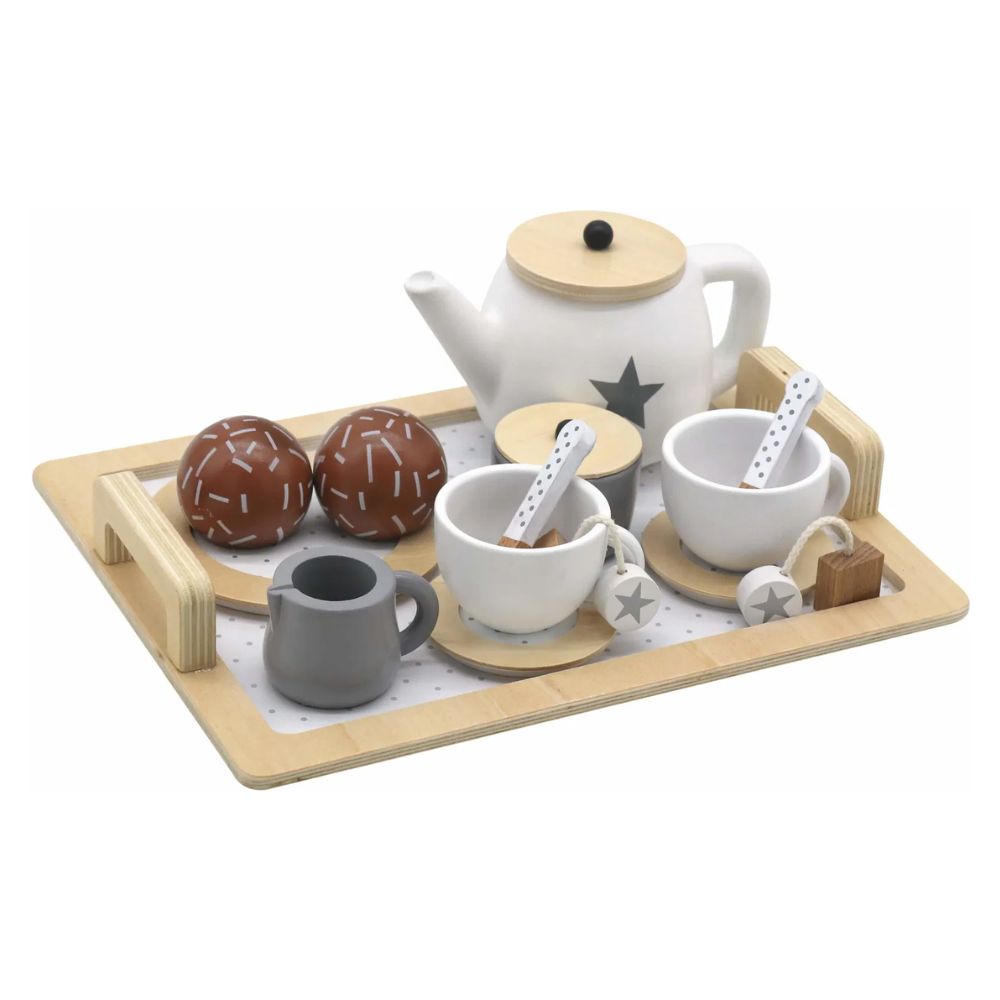 Το σετ περιλαμβάνει δίσκο με χειρολαβές, φλυτζάνια τσαγιού με πιατάκι, κουταλάκια, ζάχαρη, γάλα, τσάι, τσαγιέρα και γλυκό.