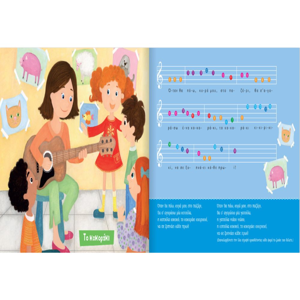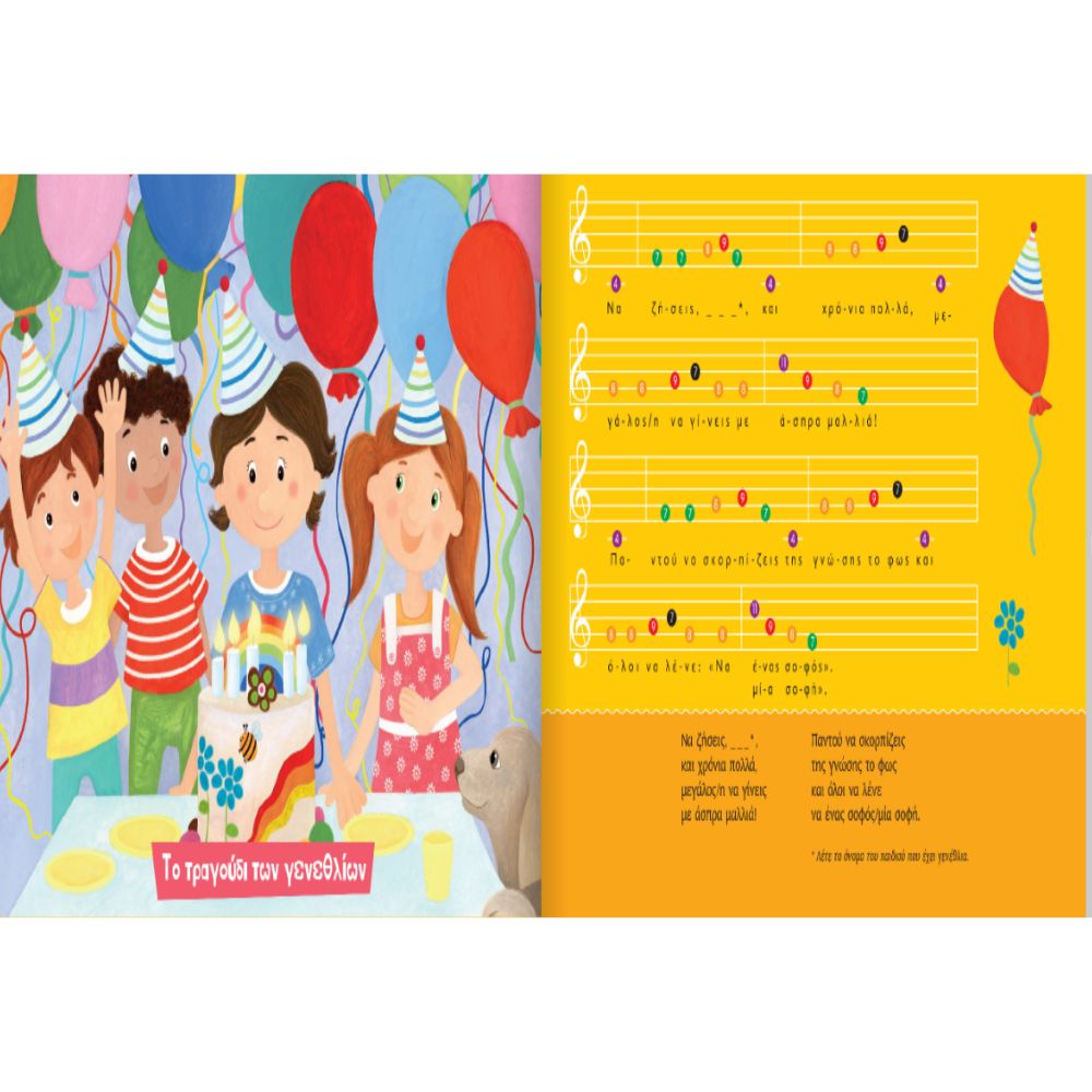 Στο βιβλίο αυτό θα βρεις μια υπέροχη συλλογή από αγαπημένα τραγούδια όπως «Το κοκοράκι», «Το τραγούδι των γενεθλίων», «Τι χαρά» και άλλα.