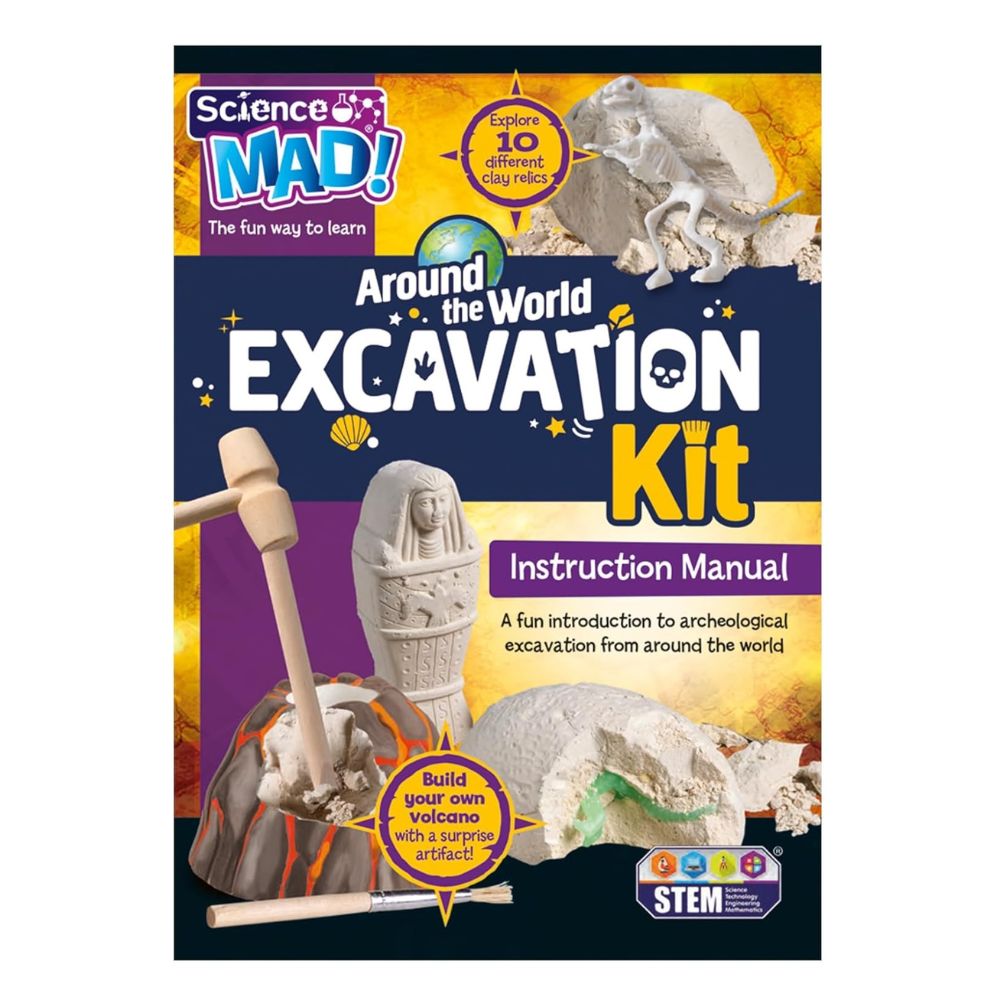 Το σετ περιλαμβάνει σχηματισμούς από πηλό που αντιπροσωπεύουν κομμάτια της αρχαίας Γης. Μέσα σε αυτούς υπάρχουν θαμμένα αντικείμενα και θησαυροί από όλο τον κόσμο. Επίσης, περιλαμβάνει όλα τα απαραίτητα εργαλεία, υλικά και χρώματα που χρειάζεστε, για να δημιουργήσετε το δικό σας ηφαίστειο. Βρείτε τα κρυμμένα αντικείμενα με το σφυρί και τη σμίλη, καθαρίστε τα με τη βούρτσα και διαβάστε το εκπαιδευτικό εγχειρίδιο οδηγιών, για να σας βοηθήσει με τις ανασκαφές σας.
