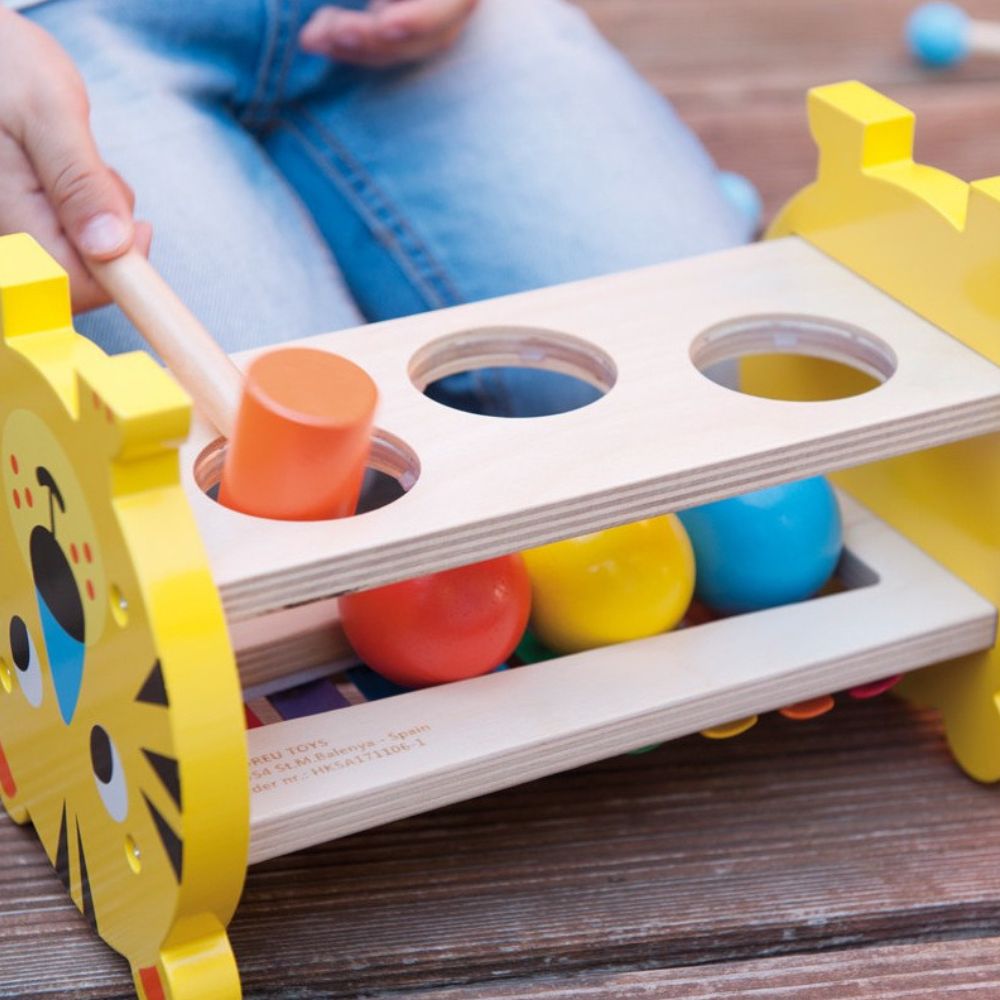 Από τη μια πλευρά το παιδάκι μπορεί να παίξει όμορφες μελωδίες με το ξυλόφωνο και από την άλλη να μιμηθεί τους τεχνίτες χτυπώντας με το σφυρί τις πολύχρωμες μπάλες.