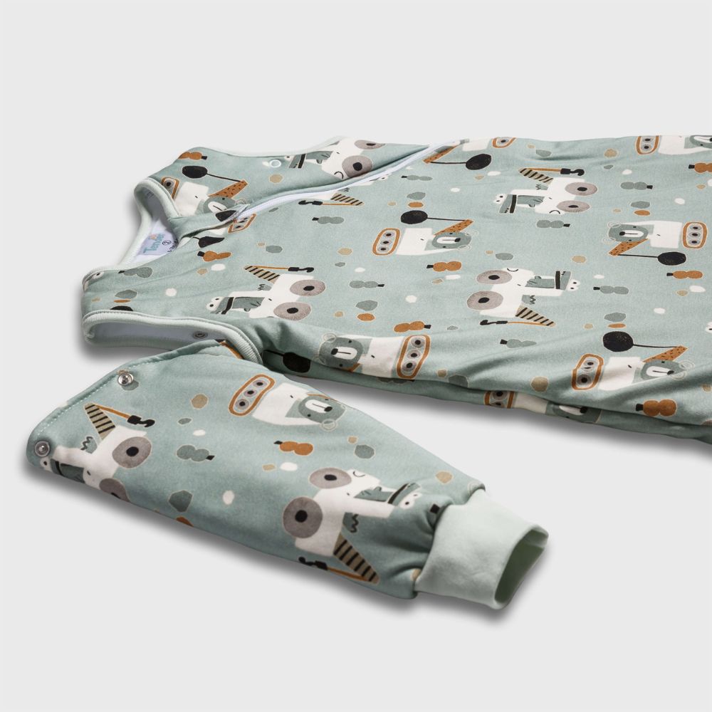 Τα μανίκια είναι αποσπώμενα ώστε να διασφαλίζεται η σωστή θερμορύθμιση του σώματος του μωρού που γίνεται μέσα από τα χέρια και το κεφάλι, βοηθώντας στον καλό εξαερισμό του σώματος. Μπορείτε όμως και να τα φορέσετε στο παιδάκι σε πιο απαιτητικές συνθήκες και χαμηλότερες θερμοκρασίες ή αν χρειαστεί να μεταφερθεί κάπου το παιδί φορώντας τον υπνόσακο.